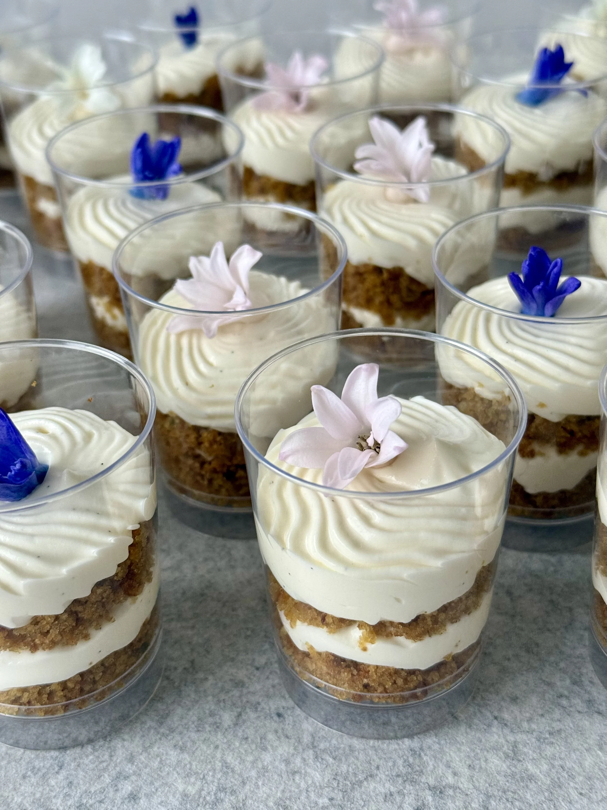 Moist cake layer made with freshly grated carrots, Ceylon cinnamon and a hint of extra virgin olive oil. Layered with silky vanilla bean cream cheese custard.