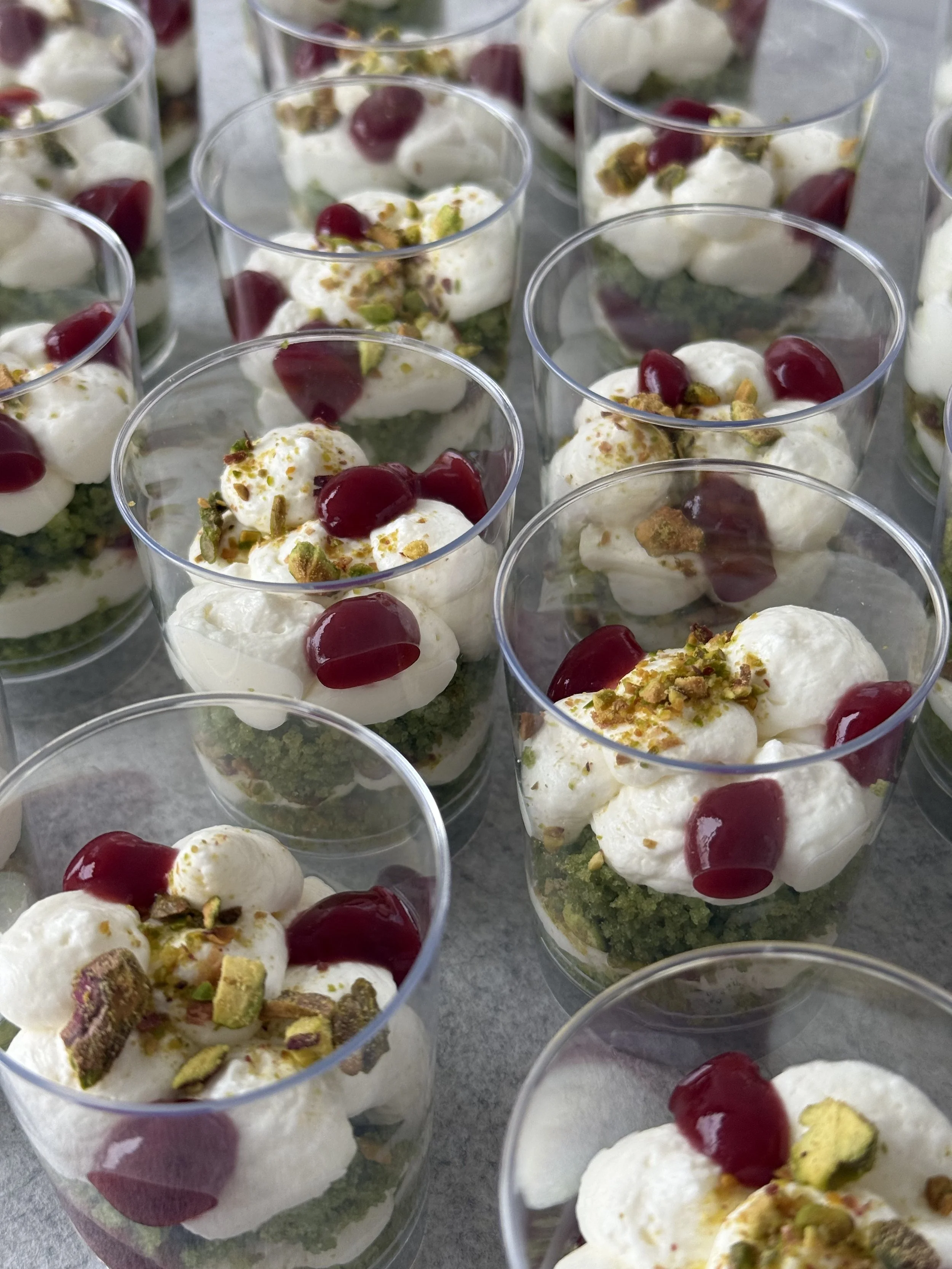 Moist vanilla cake layers (with homemade spinach food coloring), mascarpone Chantilly cream, strawberry coulis, roasted California pistachios, fresh strawberries