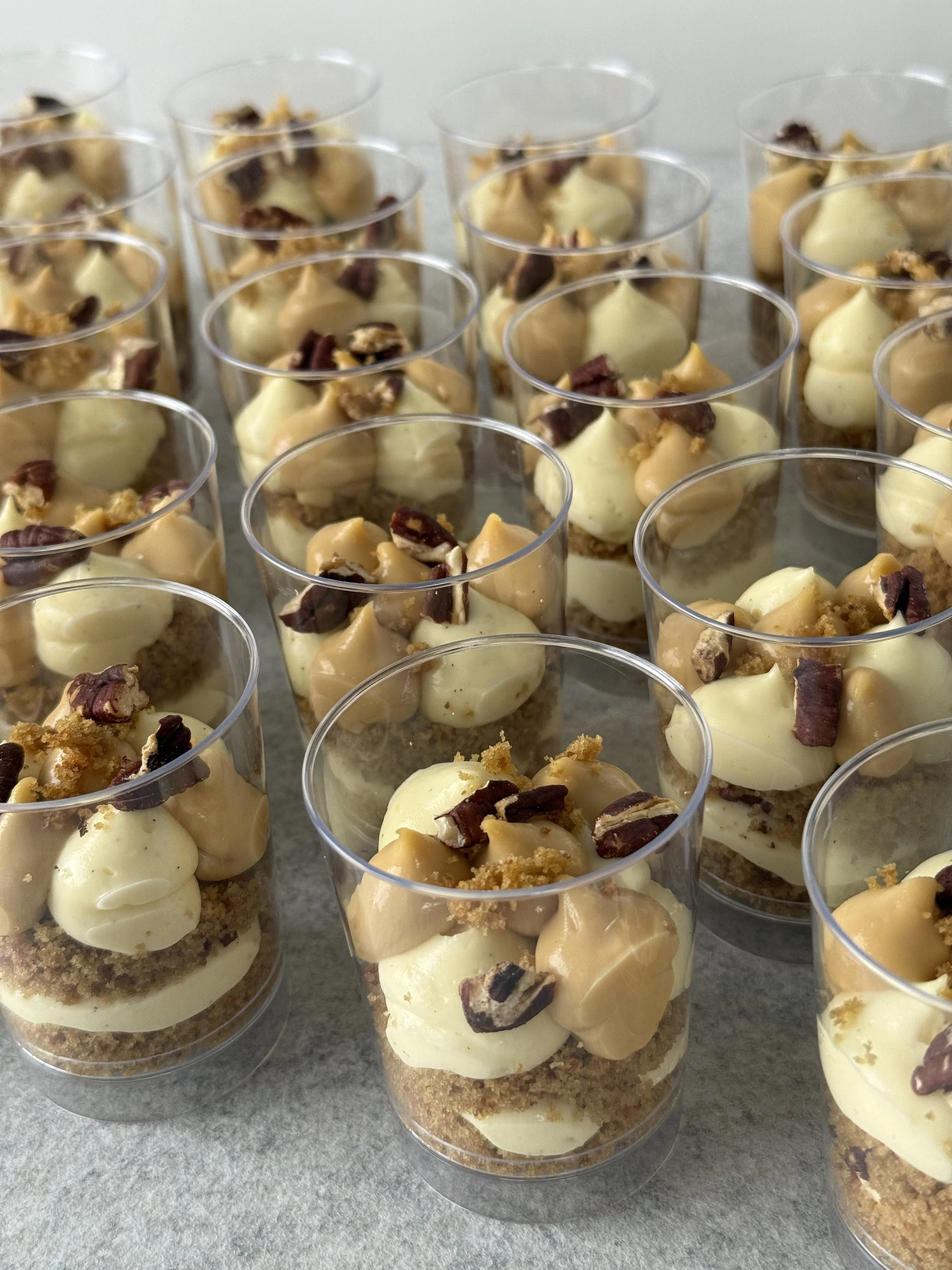 Soft Muskovado sugar cake layers, vanilla bean pastry cream, salted caramel with mascarpone, layered with toasted chopped pecans. Topped with candied pecans.