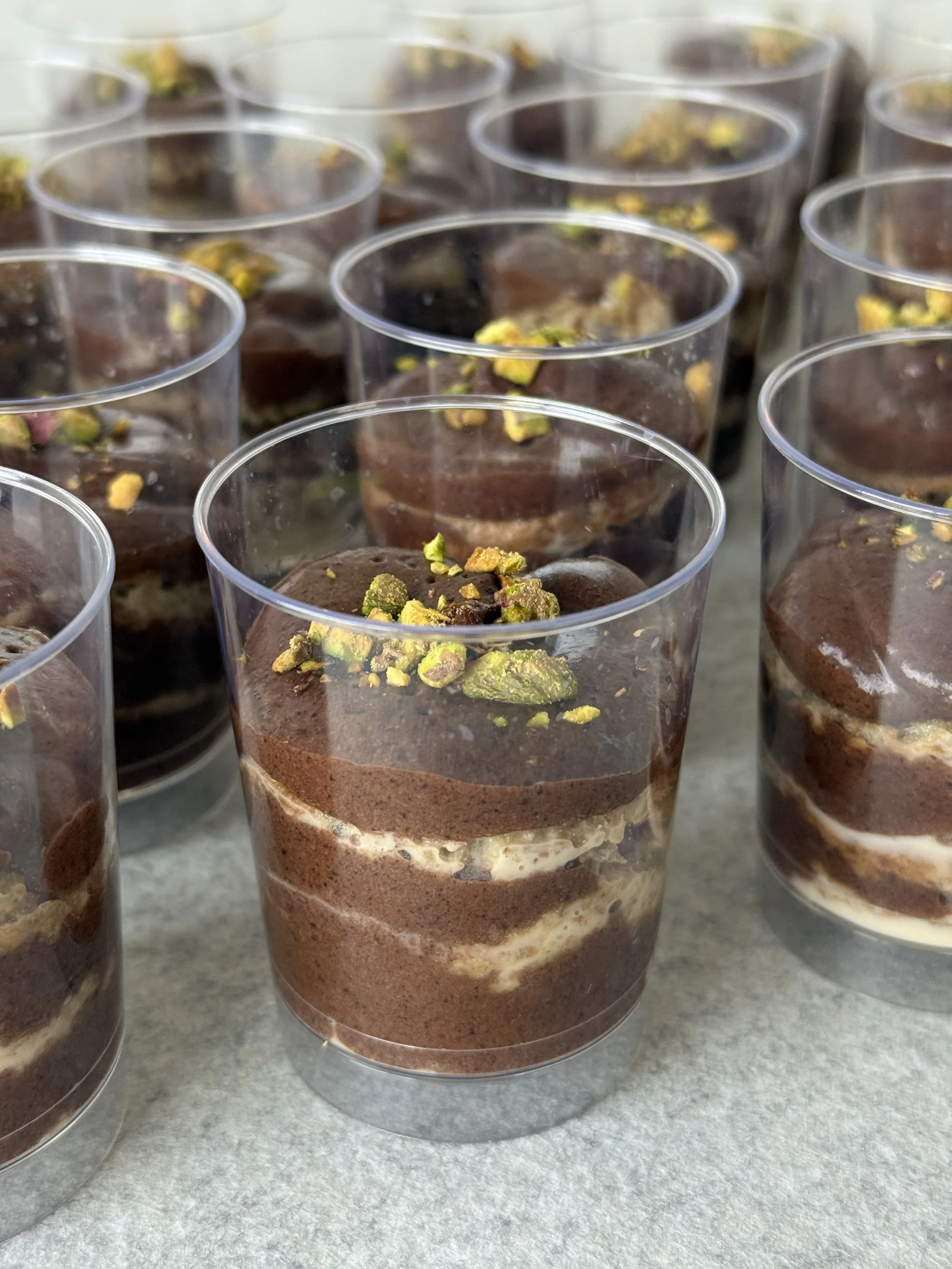 Walnut flour cake layers soaked in a touch of rum and vanilla. Layered with Belgian cocoa mousse.